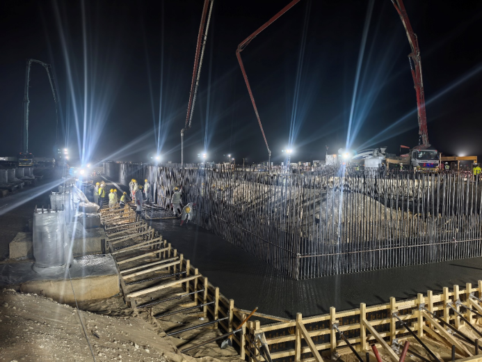 本站訊 12 月 16 日,沙特利雅思天然氣分餾設(shè)施土建項(xiàng)目單元變電站 SS01 基礎(chǔ)混凝土澆筑完成。 此次作業(yè)歷時(shí)19小時(shí),其澆筑方量高達(dá) 930m3,其澆筑時(shí)長(zhǎng)、倉(cāng)面規(guī)模,在利雅思區(qū)域所有混凝土澆筑項(xiàng)目中獨(dú)占鰲頭。單元變電站 SS01 基礎(chǔ)采用 C40 混凝土條形設(shè)計(jì),基礎(chǔ)頂部高程 EL.98.3,高度 800mm,寬度 5m,總長(zhǎng)度 218.6m。為確保此次澆筑順利進(jìn)行,項(xiàng)目部積極向周邊承包商借鑒經(jīng)驗(yàn),與拌合站深入溝通生產(chǎn)及運(yùn)輸事宜,并三次研討技術(shù)方案,精心落實(shí)交通導(dǎo)行、設(shè)備待命、熱食暖飲供應(yīng)等各項(xiàng)細(xì)節(jié)工作,對(duì)澆筑過(guò)程中可能出現(xiàn)的各類(lèi)狀況進(jìn)行了全面預(yù)估并制定詳細(xì)應(yīng)對(duì)策略。從混凝土攪拌、輸送到澆筑時(shí)的溫度把控、振搗工藝,每個(gè)環(huán)節(jié)均經(jīng)過(guò)嚴(yán)謹(jǐn)規(guī)劃與嚴(yán)格管控,贏得了業(yè)主與總包的高度贊譽(yù),阿美利雅思片區(qū)總裁 Eyad 親臨工地巡檢時(shí)也對(duì)此次成果贊不絕口。 在項(xiàng)目部的精心組織及各團(tuán)隊(duì)的緊密協(xié)作下,SS01 基礎(chǔ)混凝土澆筑順利收官,為后續(xù)施工筑牢了根基。隨著施工進(jìn)程穩(wěn)步推進(jìn),項(xiàng)目團(tuán)隊(duì)將秉持 “自強(qiáng)不息,勇于超越” 的八局精神,勇毅前行,持續(xù)攻克各類(lèi)技術(shù)難關(guān)與挑戰(zhàn),全力以赴保障項(xiàng)目順利履約。